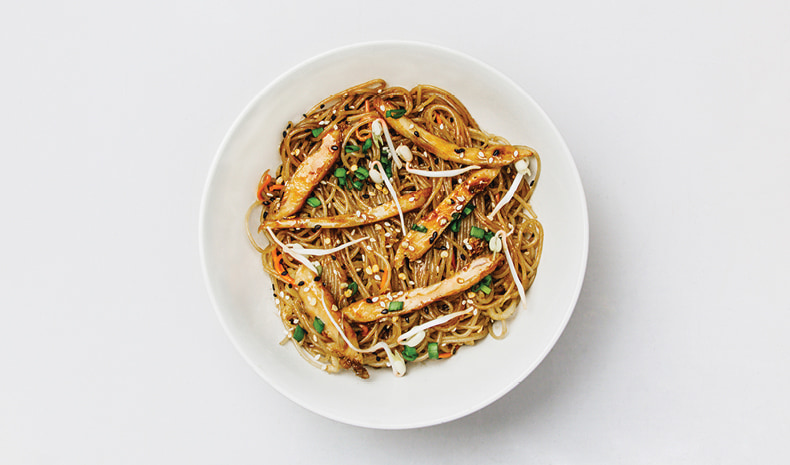 Куриное филе, яйцо, овощной микс, кунжут, соевые ростки и оригинальный соус wok.